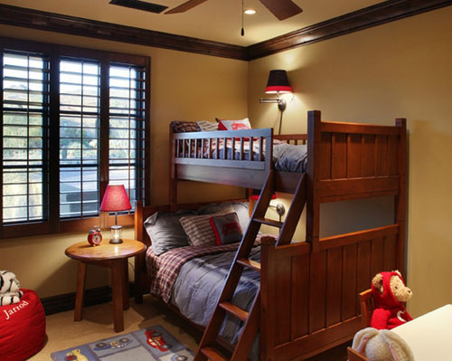 最后看看這款造型設(shè)計,純實木打造的雙層床,看著就硬朗結(jié)實,深木色的顏色,很有質(zhì)感,格子布的床品很適合運(yùn)用在深木色不床上,與房間的木質(zhì)窗,木質(zhì)小圓桌等相協(xié)調(diào)。在暖暖的燈光映射下,帶給人一種安靜閑適的田園風(fēng)情。