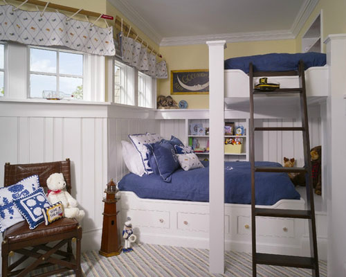 看看這風(fēng)格,藍(lán)色與白色的完美結(jié)合,營造出的是風(fēng)輕云淡的愜意之感。白色簡約的床體設(shè)計,即使在這樣看著并不怎么寬敞的空間中這種雙層床也并沒有讓人感覺到擁擠。做工精細(xì)的布藝,恰當(dāng)好處的色彩搭配比例,洋溢著濃濃的自由愜意之感。
