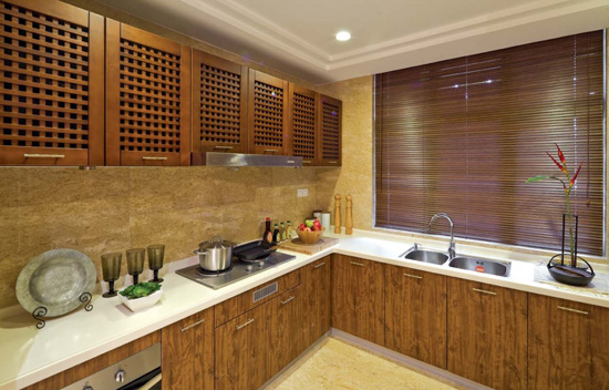 東南亞風(fēng)格廚房設(shè)計運用的石材、原木定制品較為普遍,色調(diào)多為棕色、深木色這類的帶自然感覺的顏色,給人以沉穩(wěn)、原始、自然的感覺。利用細(xì)節(jié)與色彩點綴其中的的巧妙手法,使之跳出了普通設(shè)計,使得熱帶的東南亞自然風(fēng)情更顯濃郁。