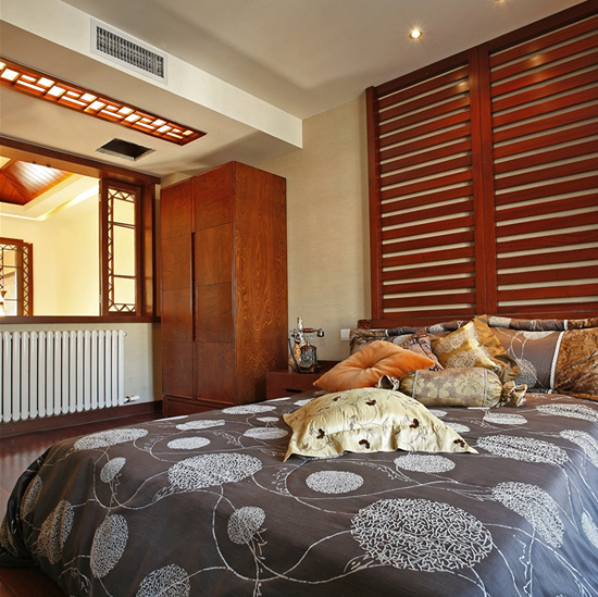 臥室的設(shè)計色調(diào)多選用深木色,線條簡約的木質(zhì)家具,自然逼真的花紋,金色布料制成的抱枕、床上用品等裝飾品,與燈光光線的交織在一起,營造出內(nèi)斂謙卑,舒適溫馨的感覺。
