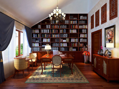 書房:書房是房主人用來辦公學習的地方,中式田園風格的書房自然不能少了清幽淡雅的感覺。對于中式田園風格書房的設計,田園的氣息要從細微之處體現(xiàn)整體上則要以平間簡潔的元素為主。綠色是大自然的主打顏色,啞綠作為書房的主色調,可使得這個書房即雅致有很有穩(wěn)重感,與淡綠色的窗簾相呼應,甚是和諧。當然,深木色的主題色調也是很適用于中式田園風格書房的色調,沒有雕工細膩繁雜的雕花,少了那份柔美,卻多了幾分硬朗,與書房氣氛相得益彰。