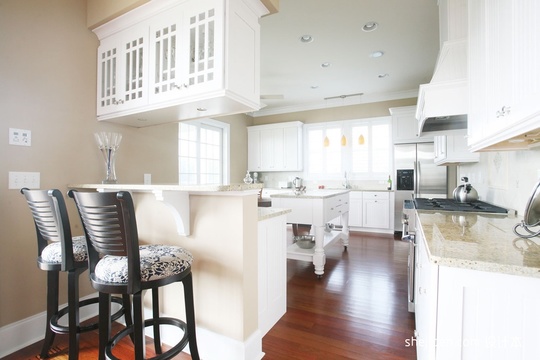 前述是從空間的橫面進(jìn)行規(guī)劃設(shè)計(jì)的,而櫥柜的高低、與人、廚房的高低,要保持協(xié)調(diào)的氛圍,比較常規(guī)的是,臺(tái)面高度在80~85 厘米,工作臺(tái)面與吊柜底的距離約需50~60 厘米,而放雙眼灶的爐灶臺(tái)面高度最好不超過(guò)60厘米。不過(guò)臺(tái)面的高度可以根據(jù)消費(fèi)者的身高、下廚時(shí)所做的事項(xiàng)、還有個(gè)人喜好進(jìn)行設(shè)計(jì)和擺放,比如,個(gè)子矮的人下廚,臺(tái)面低點(diǎn)感覺會(huì)更舒服一些,還有,華北、東北區(qū)域一些以面食為主的家庭,櫥柜的臺(tái)面低一點(diǎn),做面食時(shí)會(huì)感覺更舒服一些。不過(guò),臺(tái)面的高低,實(shí)際上只有10厘米左右的選擇余地,如果是在較小的廚房,櫥柜的臺(tái)面又不能太低了,否則會(huì)影響整體性的美觀。