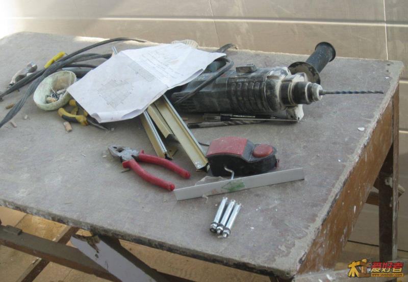 在材料準(zhǔn)備上,既有集成吊頂?shù)哪K等材料,還有全部使用的各種工具,像需準(zhǔn)備的工具就有卷尺(測(cè)量長(zhǎng)度、高度)、透明水管(墻體水平測(cè)量)、墨斗(墻體弾線)、等邊直角三角尺(邊角料等斜邊切割測(cè)量)、專用剪刀(材料細(xì)微修剪)、切割機(jī)(切割龍骨、收邊條)、磨光機(jī)(材料毛邊修整)、電錘(墻體打孔)、手槍鉆(龍骨等材料打孔)、金剛鉆頭(瓷磚墻體打孔)等等,共有二十多種工具。